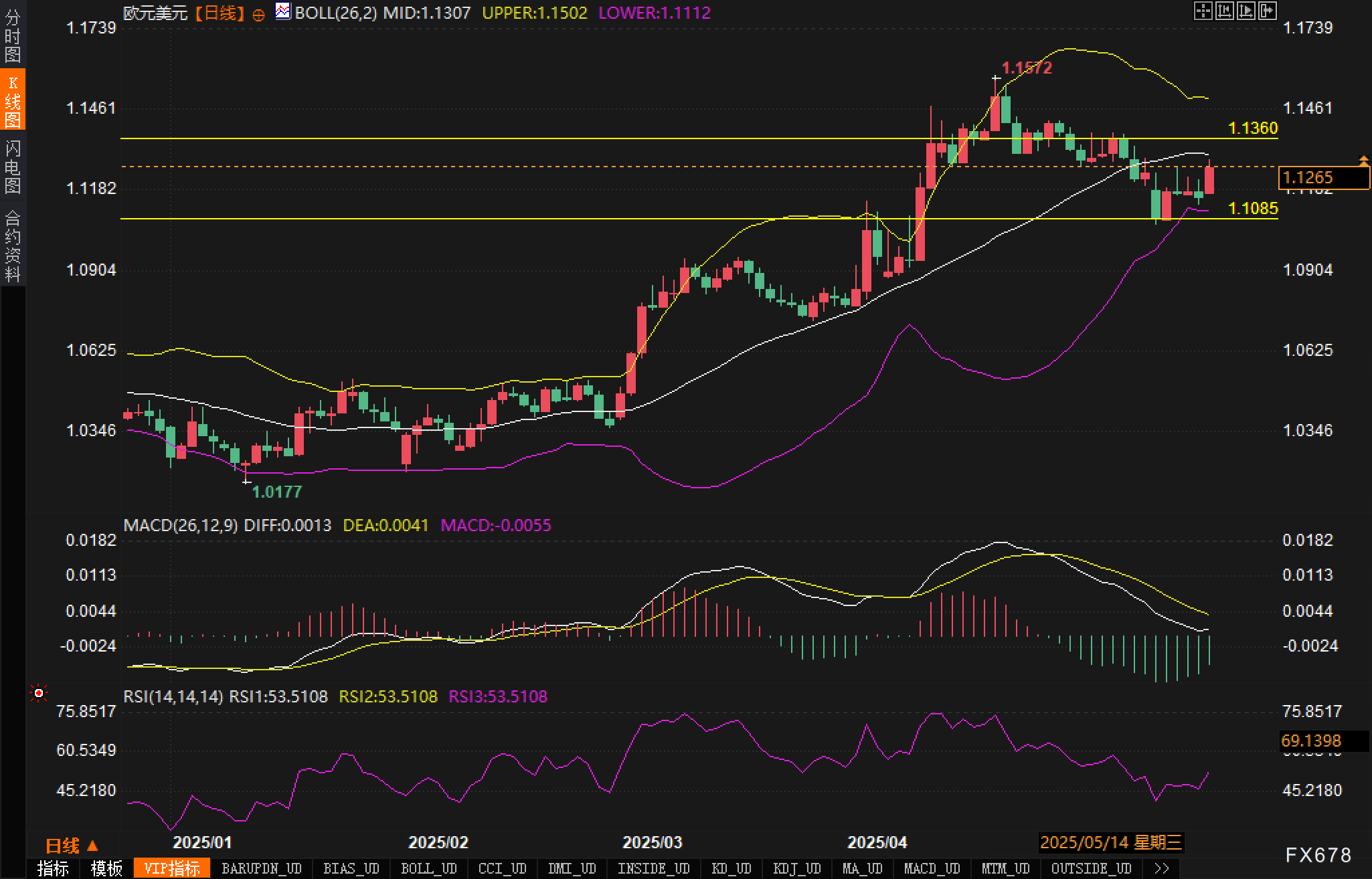 布林带指标显示上轨位于1.1502,中轨位于1.1307,下轨位于1.1112,汇价目前位于中轨下方。布林带开口有收窄迹象,表明短期波动可能减弱。