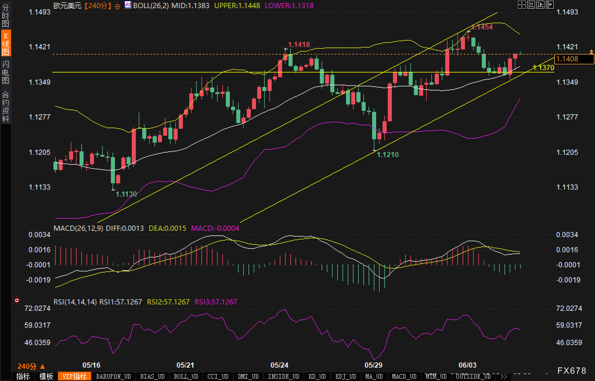 从240分钟图表来看,欧元兑美元汇价在1.1370附近构筑阶段性底部。汇价目前运行在布林带中轨(1.1383)上方,上轨位于1.1448,下轨位于1.1318。汇价面临1.1418和1.143两个水平阻力位的压制,突破这些位置是进一步上行的关键。