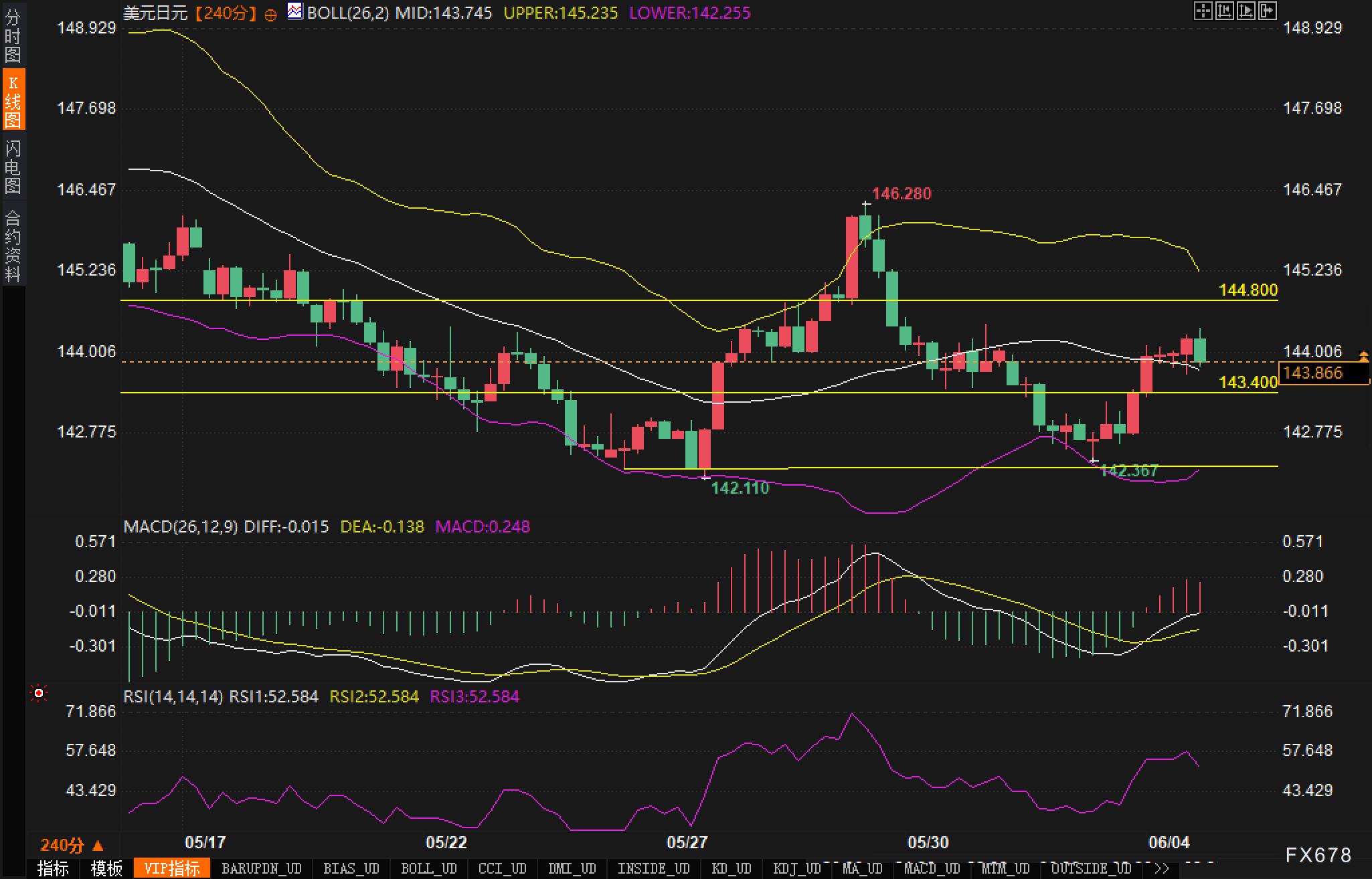 从K线形态看,前期高点146.280构成明确阻力,而当前144.800一线亦表现为重要阻力位。若上破该位并企稳,将打开上行空间,挑战146.00区域。反之,若汇价持续受阻144.00上方,或将陷入短期整理。