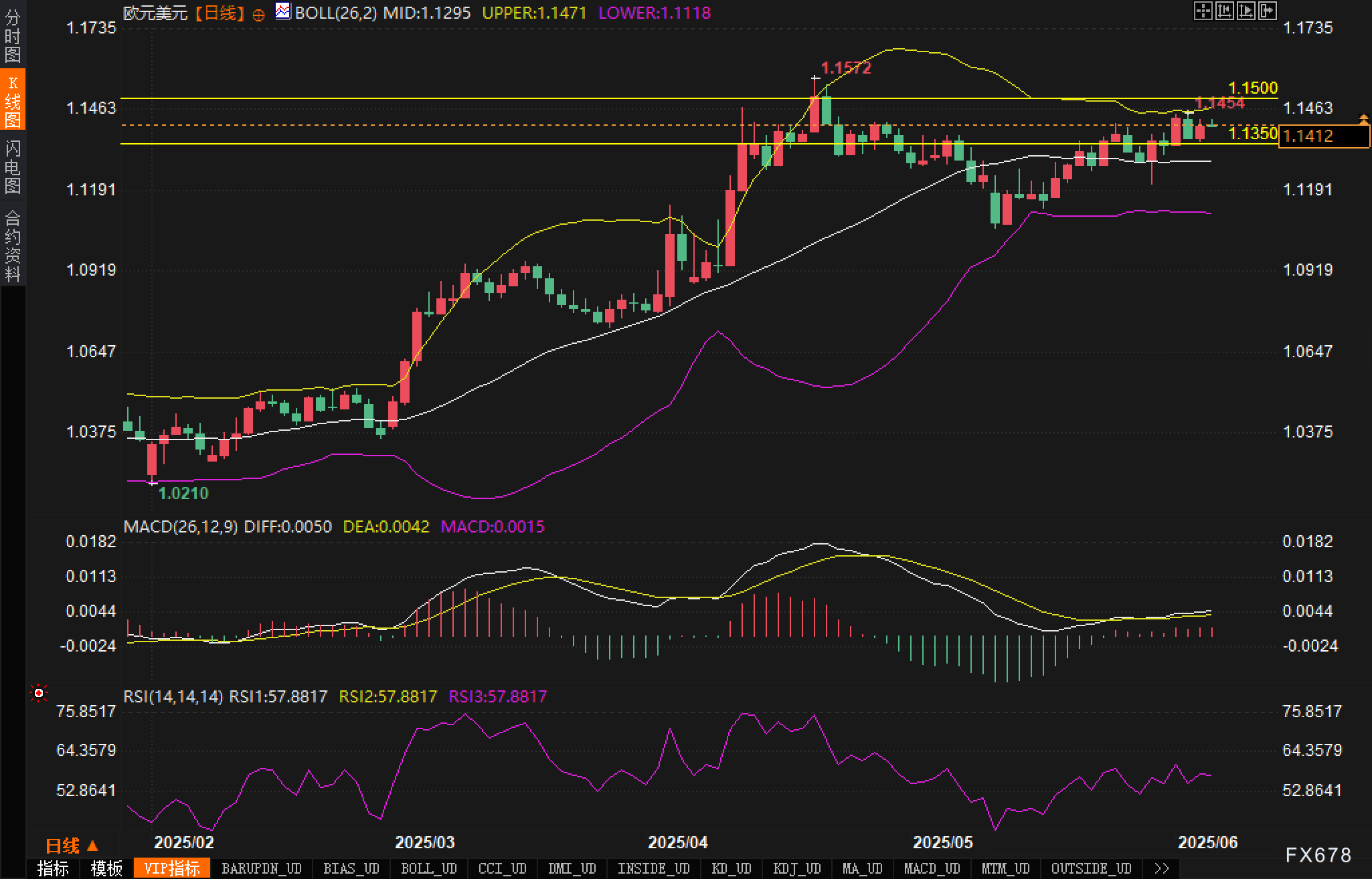 近期高点集中于1.1435一线,构成短线阻力,向上关键阻力位见于高点1.1500及近期顶部1.1572,若突破后续或上测1.16区域。支撑方面,短线支撑位于1.1350附近,进一步回撤可能测试1.1295(布林中轨)。