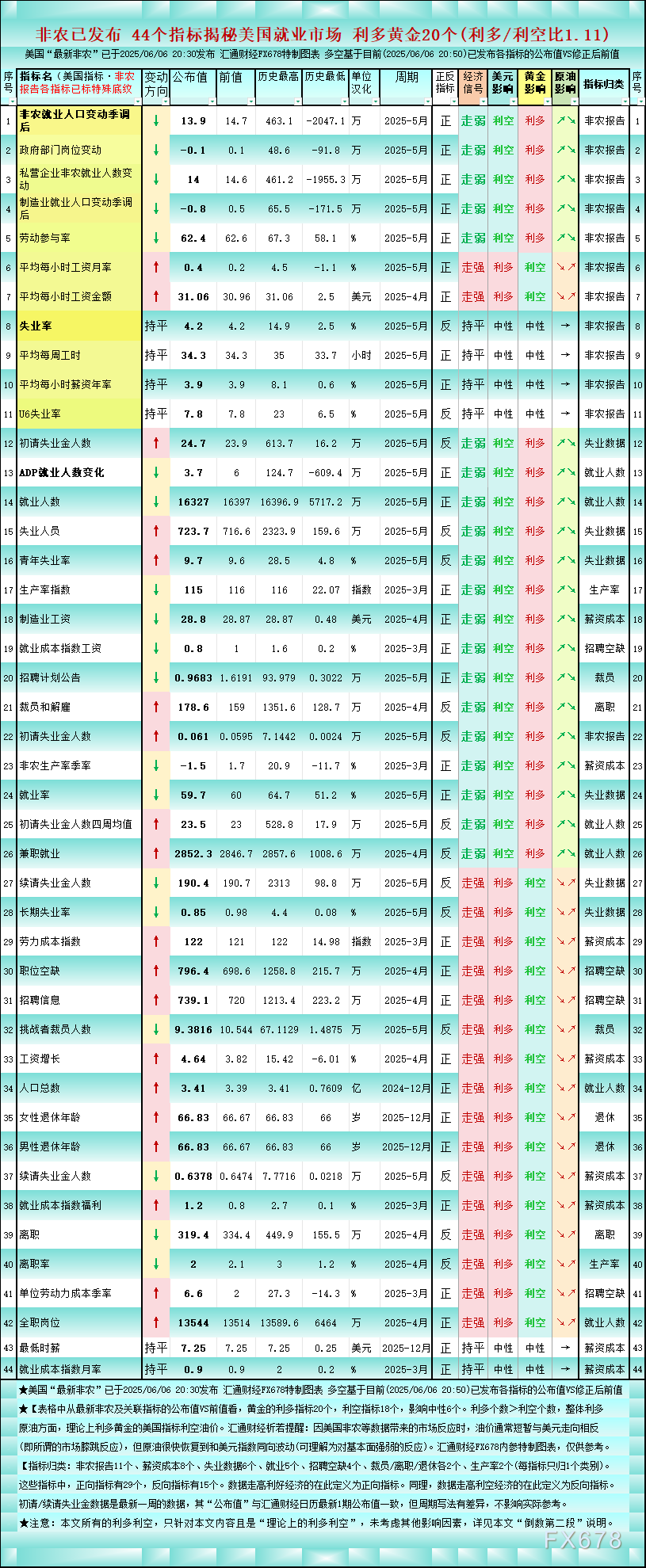【(上图:非农已发布 44个指标揭秘美国就业市场 利多黄金20个(利多/利空比1.11) 来源:FXTM外汇官网FX678特制图表 本图多空基于目前(截止2025/06/06 20:30)非农夜已出炉的最新美国非农的公布值VS前值的比较结果。