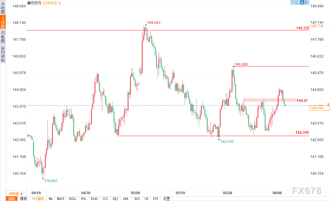 FXTM外汇官网APP讯——周一(6月9日)欧盘时段,美元兑日元盘中小幅走跌,盘中交投于144.06附近,跌幅0.55%。分时图上,价格波动大,均线整体下行,价格多数时间在均线下方,短期趋势偏空。
