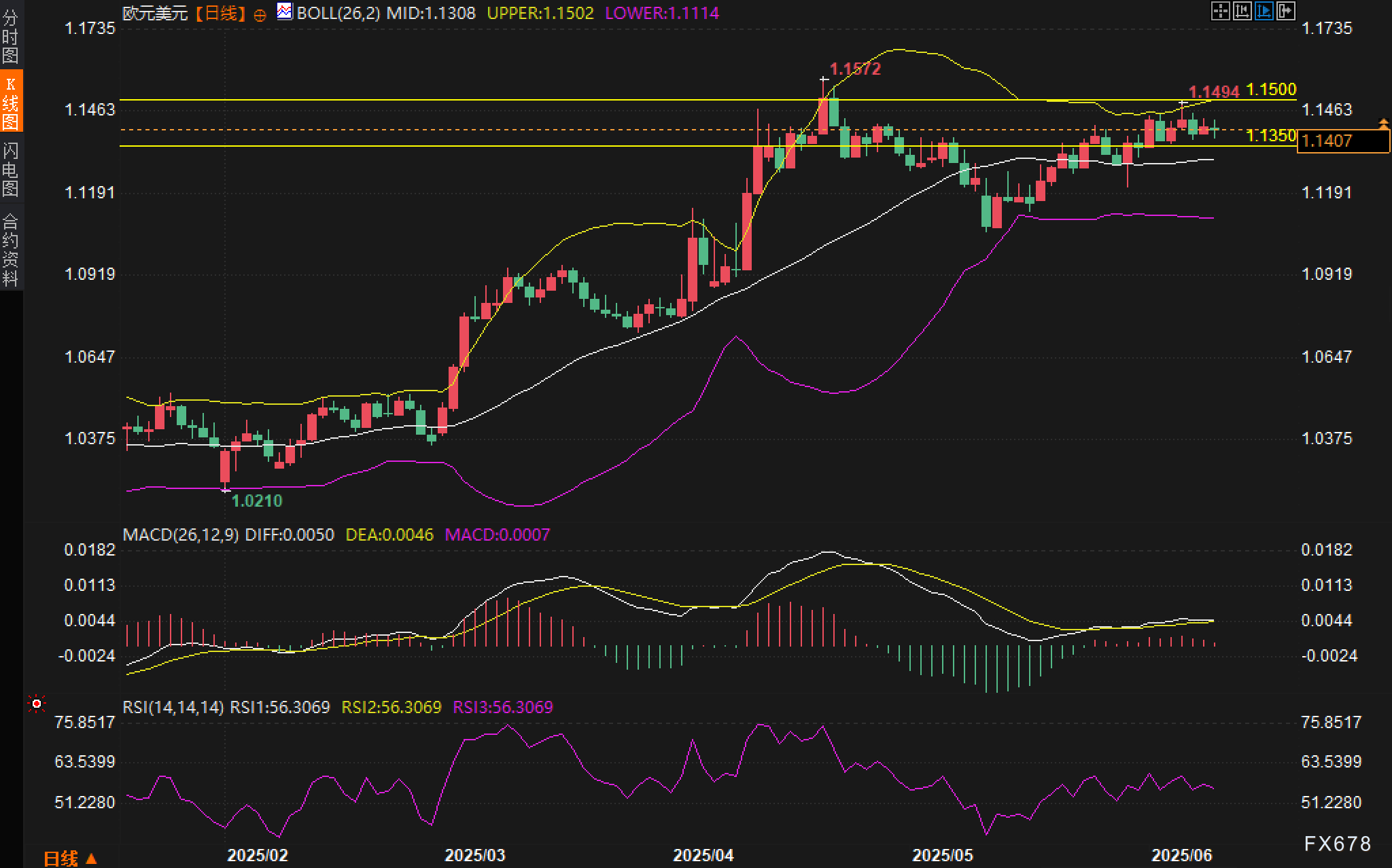 从日线图表观察,欧元兑美元汇价在1.1114-1.1502区间内呈现典型的箱体震荡格局。布林带显示汇价运行在中轨1.1308附近,上轨位于1.1502,下轨处于1.1114,当前价格贴近布林中轨运行,反映出市场缺乏明确方向性。