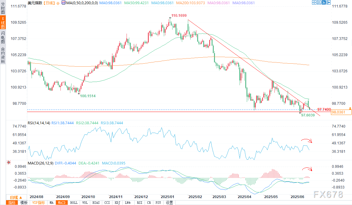 FXTM外汇官网APP讯——周二(6月24日)欧盘时段,美元指数整体呈下行趋势,跌破关键支撑位,弱势特征明显,短期空头力量主导。