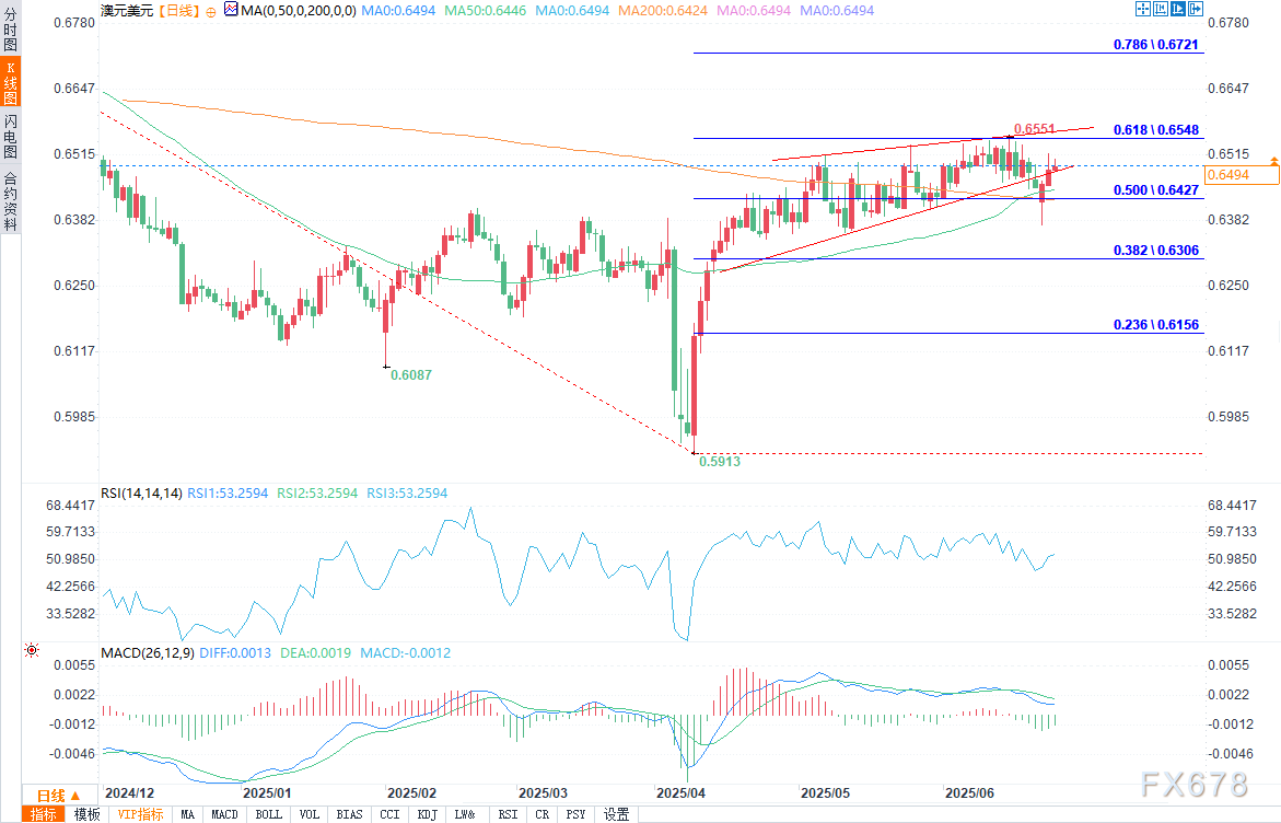 FXTM外汇官网APP讯——周三(6月25日),澳元/美元价格呈现明显的震荡走势,有多次冲高回落、探底回升,显示短期多空博弈激烈。