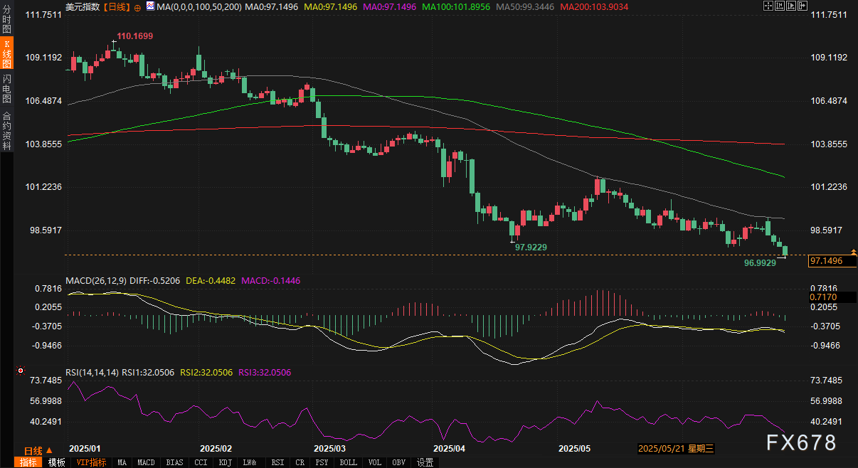 关键点位:日内低点96.9929成为短期支撑,若跌破可能下探2021年低点96.50;上方98.20(前低转阻力)构成反弹第一道屏障。