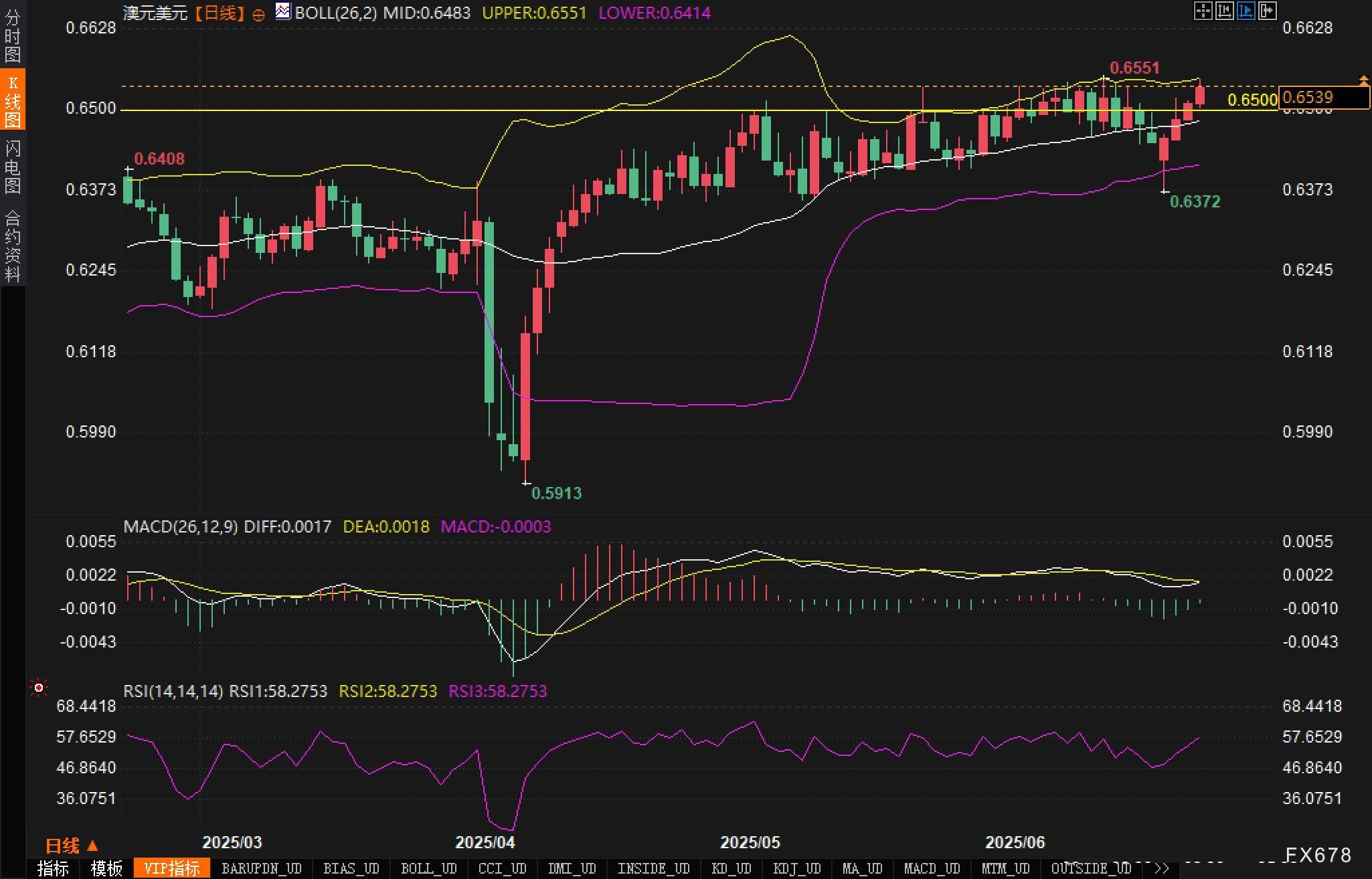 关键价位:0.6551为阶段新高,短期阻力明确。下方支撑位在心理整数0.6500和布林中轨0.6483。