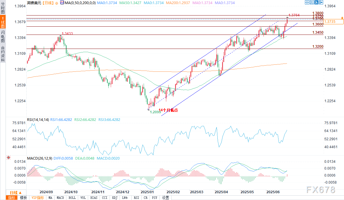 受以色列与伊朗停火持续改善风险情绪的推动,同时美元因市场对美联储独立性的担忧及降息预期而走弱,英镑/美元已跃升至1.3764,创下3.5年新高。