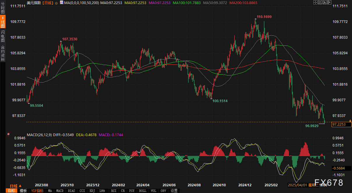 FXTM外汇官网APP讯——周五(6月27日),美元指数延续弱势整理,技术面呈现空头格局:50日、100日及200日均线分别下压至99.3075、101.7884和103.8866,形成典型空头排列。MACD指标中,DIFF线(-0.5548)已下穿DEA线(-0.4677),且柱状图扩大至-0.1738,显示短期动能持续偏弱。当前市场焦点集中于北京时间今晚20:30公布的美国5月核心PCE数据,这一美联储最青睐的通胀指标或成为决定7月利率政策的关键变量。