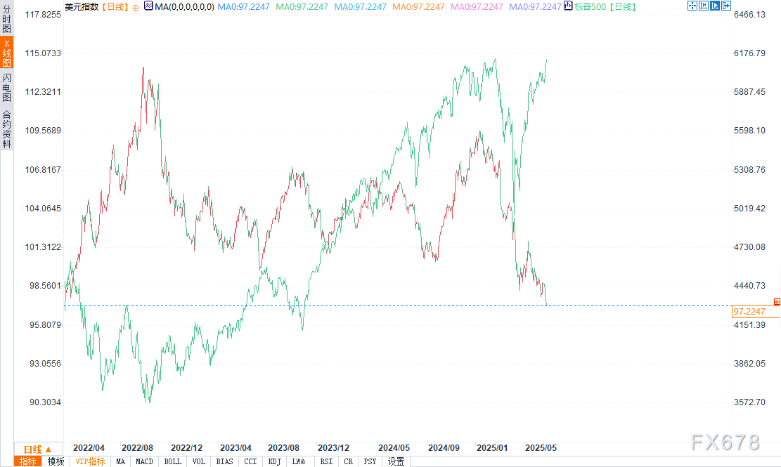 FXTM外汇官网APP讯——中东冲突曾一度重塑了美元的避险资产地位,但这也成为了其走弱的诱因。随着全球风险偏好升温,美元与美股指数的负相关性导致美元指数触及三年低点。投资者将以色列与伊朗之间“十二日战争”的停火视为冲突终结,正纷纷买入股票。