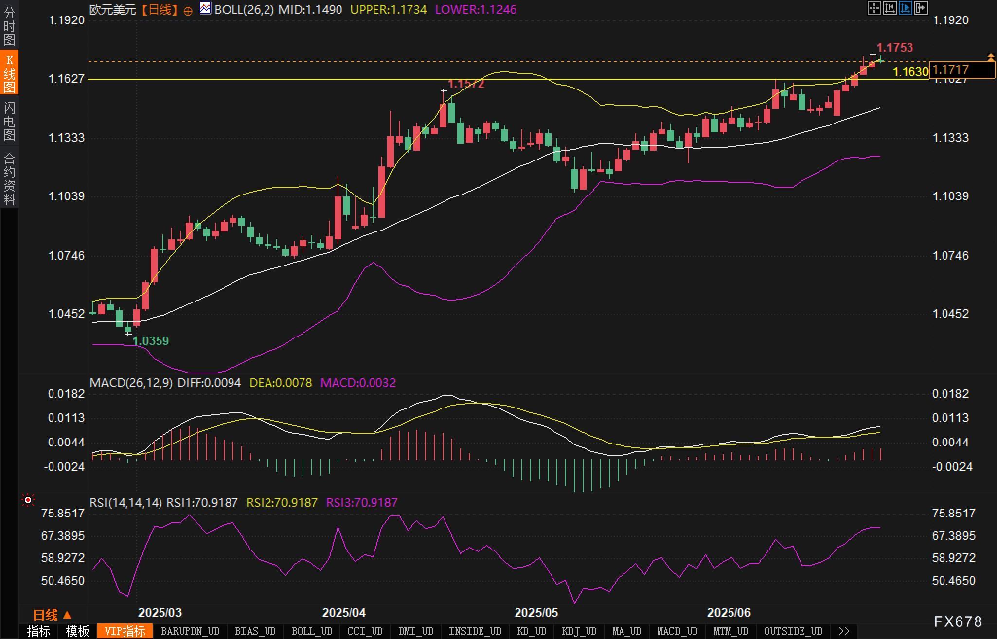 从日线图来看,欧元兑美元维持在明显的上升趋势中。汇价自低点1.0359启动反弹,并在6月下旬突破1.1630前期阻力,上行至1.1753,录得阶段性新高。图中布林带呈现开口放大形态,布林上轨在1.1734附近,布林中轨支撑上移至1.1490,显示多头趋势未改。分析认为若后续汇价站稳1.1734水平,则有望继续测试并突破1.1753高点,进一步指向心理关口1.1800。