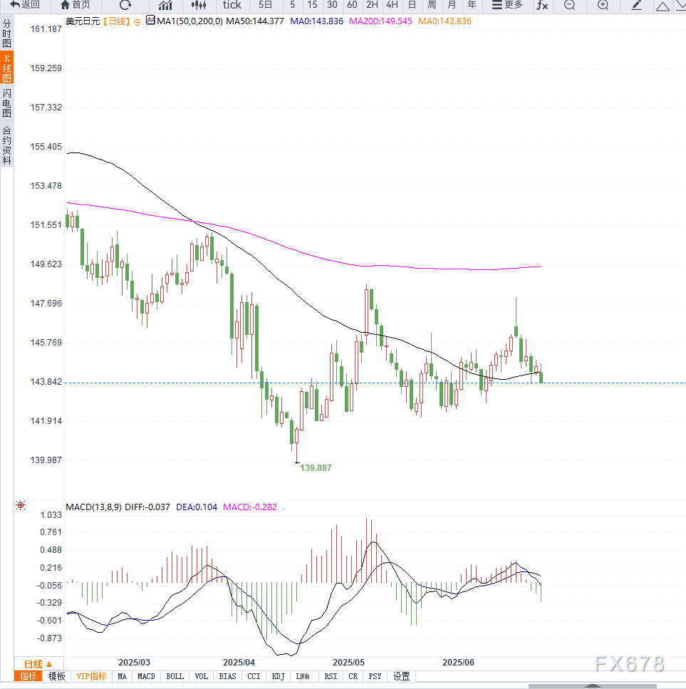 美元兑日元日线图显示,汇价目前已跌破50日均线支撑,短期内趋势偏空。相对强弱指数(RSI)跌至44附近,反映卖压增强。若持续走弱并跌破143.50,