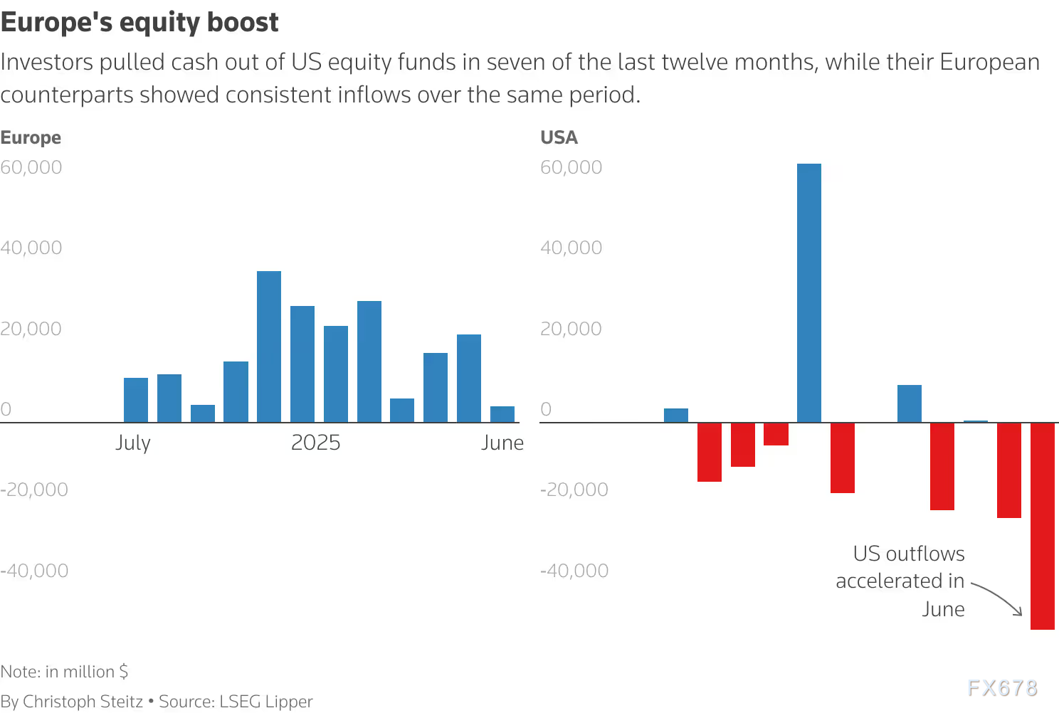 FXTM外汇官网APP讯——近年来,全球投资市场风云变幻,美国因贸易战不确定性引发投资者担忧,而欧洲凭借相对稳定的政策环境和基础设施投资热潮,逐渐成为全球资本的“新宠”。2025年,资金流向发生戏剧性转变,欧洲股票基金吸金超千亿美元,而美国市场则面临资金加速流出的窘境。究竟是什么推动了这股投资热潮?欧洲能否抓住机遇,巩固其吸引力?本文将从多个角度深入剖析这一现象。