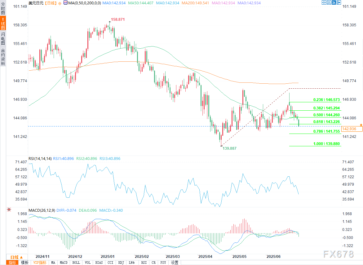 从6月23日的高点(148.02)开始的下降趋势仍在继续,关键支撑在142.30和141.95(76.4%斐波那契回撤位),守住了在140.00/139.88(4月22日的心理/2025低点)的关键支撑。