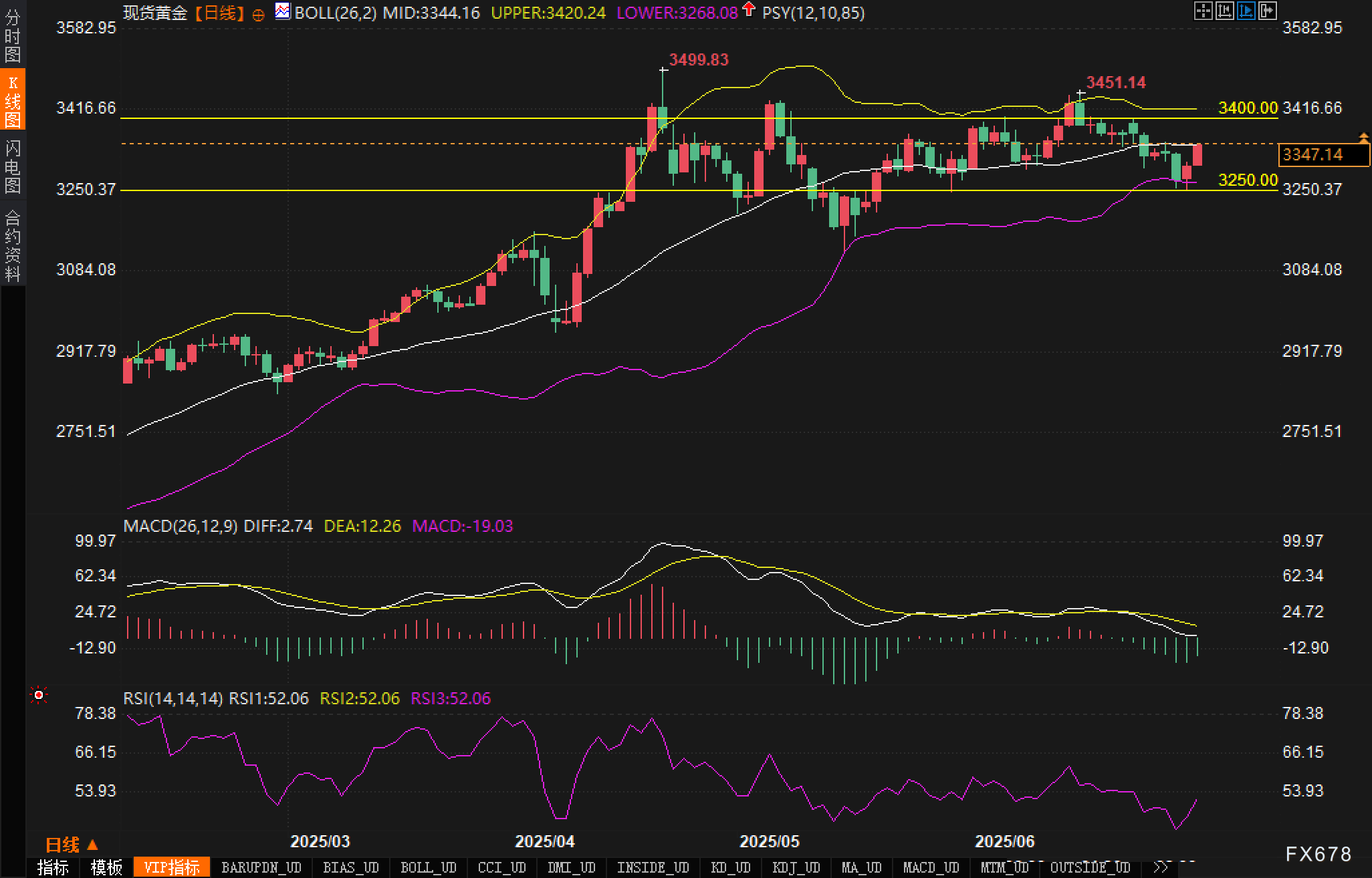 从日线图观察,黄金目前运行于典型的布林带区间之内,布林中轨位于3344美元,当前价格交投于该中轨附近,显示多空交投尚未打破均衡状态。布林带上轨和下轨分别位于3420美元与3268美元,形成明显的上下边界限制。