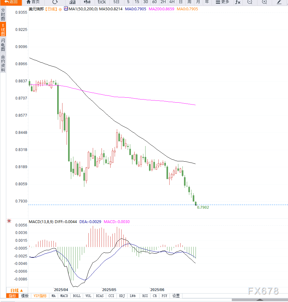 USD/CHF当前持续沿下降通道运行,并有效跌破长期技术支撑位0.8000。日线图显示,动能指标(如MACD和RSI)持续下探,14日RSI已进入超卖区间,但未出现明显背离信号。