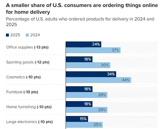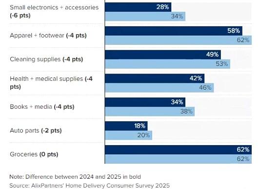 图:美国进行送货上门网购的成年人比例下降(各商品类别2024年和2025年对比)