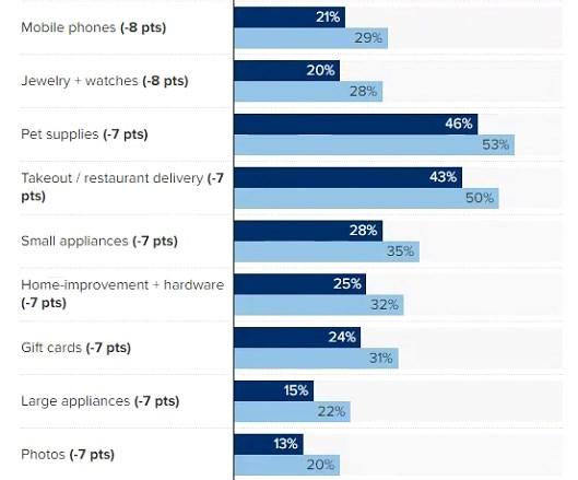 AlixPartners的数据显示,主要品类的送货上门网购经历了两位数百分比的同比下降,其中办公用品下降了13个百分点;体育用品,下降12个百分点;化妆品、家具、家居用品和大型电子产品,每一个都下降了10个百分点。