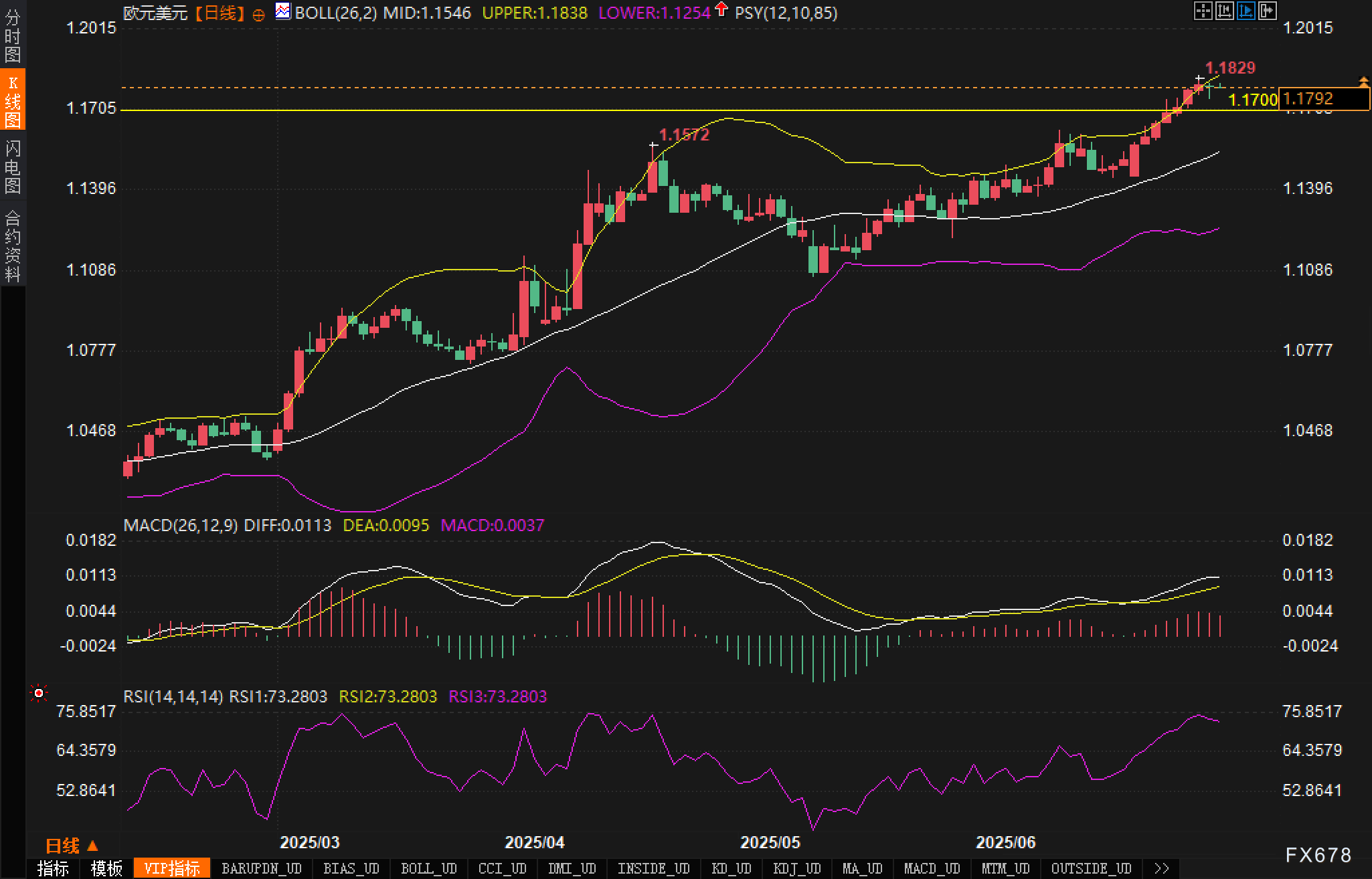 从日线图观察,欧元兑美元整体维持在上升通道内运行,布林带通道继续开口,布林中轨(MID)1.1546上移,当前K线已接近布林带上轨(UPPER)1.1838附近压力区。近期汇价自1.1572一线加速上攻,最新高点在1.1829,但随即遇阻回落,暗示上方存在短期抛压。