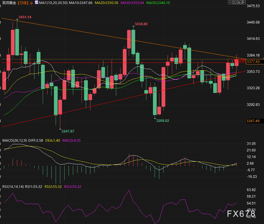 技术显示黄金价格站上了3370的关键价位,一定程度化解了8月11日形成的黄昏之星组合对金价压制,目前在挑战金价4月份开始形成的原始下降压力线。