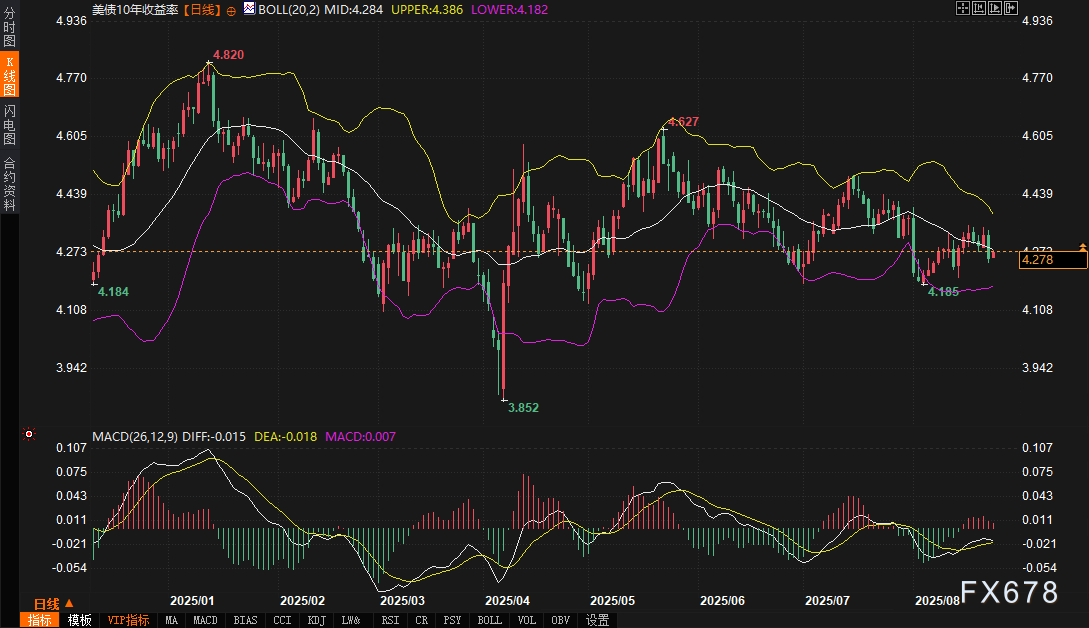 10年期美债收益率报4.277%,接近月内低点4.186%,位于布林带中轨(4.284%)下方,显示趋势偏弱。短期和中期均线差距仅2个基点,表明市场动能不足,交易员倾向于区间操作。2年期美债收益率3.715%则显示短端收益率相对抗跌,可能反映市场对短期经济数据的乐观预期。收益率曲线方面,2年/10年和10年/30年曲线分别趋平0.6个基点和趋陡0.8个基点,表明市场对长期经济前景的看法仍存分歧。美债收益率的低位运行对非收益资产如黄金有利,同时削弱美元的吸引力。