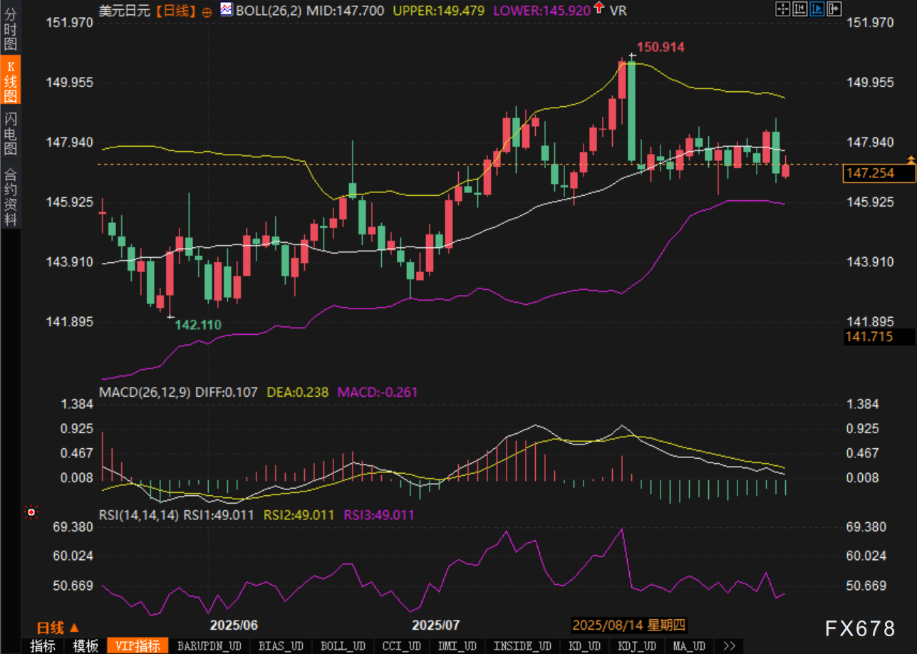 美元兑日元近期的走势依旧维持在147.00附近震荡整理。布林带显示价格当前处于布林中轨和下轨之间波动,价格未能突破149.50的上轨,也未能跌破145.90的下轨,表明市场当前处于整理阶段,缺乏明显的趋势方向。