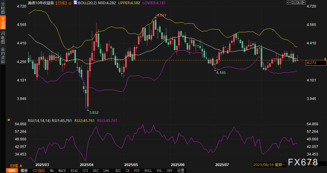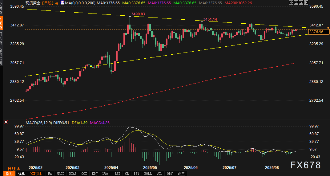 FXTM外汇官网APP讯——周二(8月26日),现货黄金价格在3378.86美元/盎司附近窄幅震荡,日内涨幅0.39%,显示市场在高位盘整中寻求方向。美元指数(DXY)报98.1829,日内下跌0.25%,继续在97.70-98.50区间内运行,动能不足。10年期美债收益率回落至4.275%,接近月内低点4.186%,对黄金等非收益资产形成支撑。市场情绪受到近期美联储政策预期和地缘政治因素的影响,黄金作为避险资产的吸引力有所增强,但短线波动仍受美元走势和美债收益率的牵制。本文将结合基本面与技术面,深入剖析现货黄金的当前动态,并展望未来趋势。
