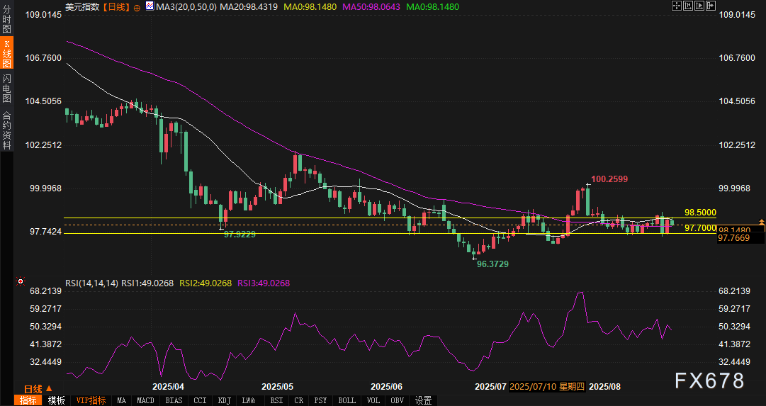 10年期美债收益率报4.275%,接近布林带中轨4.282%下方,显示趋势偏弱。2年期美债收益率报3.702%,反映市场对长期经济前景的分歧。美债收益率的低位运行削弱了美元的吸引力,同时为黄金提供了有利环境。美元指数在97.70-98.50区间内波动,短期受20日均线(98.4326)压制,50日均线(98.0645)构成阻力。有交易者指出,美联储降息预期和特朗普的关税言论可能继续削弱美元,增强黄金的吸引力。然而,美元短期的回升动能可能对金价构成一定阻力。