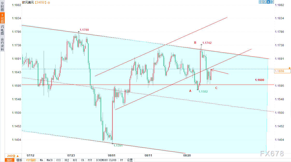 综合以上所有因素,我们可推测:短期内,空头可能会尝试突破1.1600支撑位,并推动欧元/美元汇率向主下降通道的中位线靠拢。