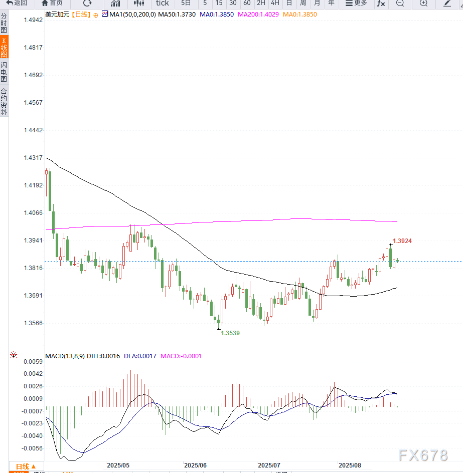 加元方面,贸易谈判结果或成为决定其后续走势的关键。短期USD/CAD可能维持在1.3820–1.3920区间震荡,突破方向取决于经济数据和谈判进展。
