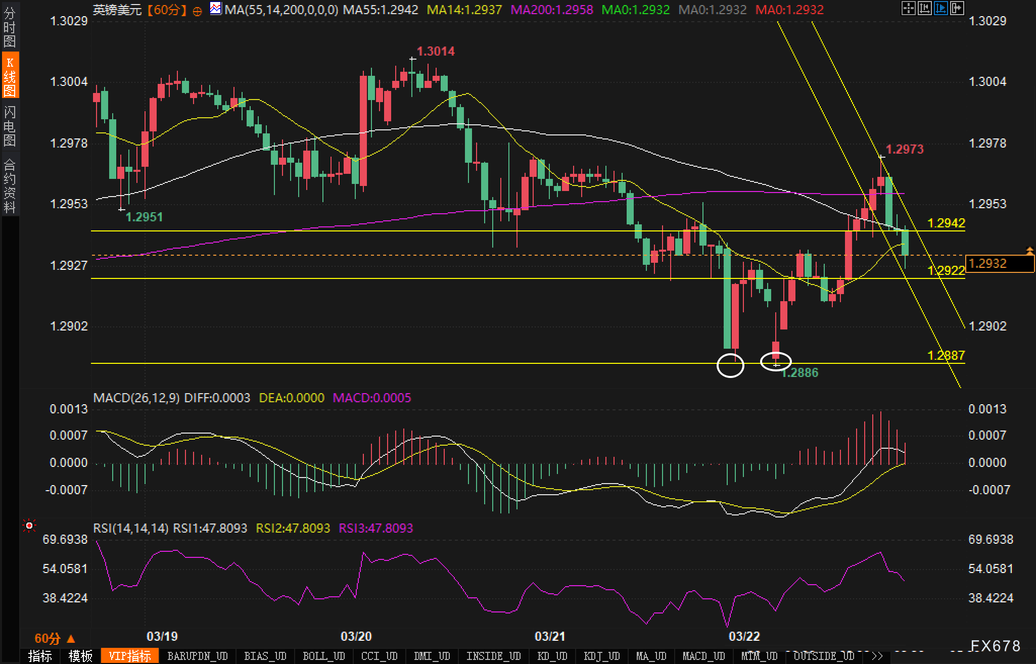 从60分钟图来看,英镑/美元在跌至1.2886的低点后开始反弹,目前正尝试突破由两个下降趋势线形成的通道。MACD指标显示正势能仍在,而RSI指标也从超卖区域回升至47.8,显示短期动能正在改善。值得注意的是,汇价已站上1.2930的水平,但要确认真正突破还需站稳1.2942的阻力位。此外,55均线和200均线分别位于1.2942和1.2958,这些水平构成了重要的技术阻力带。