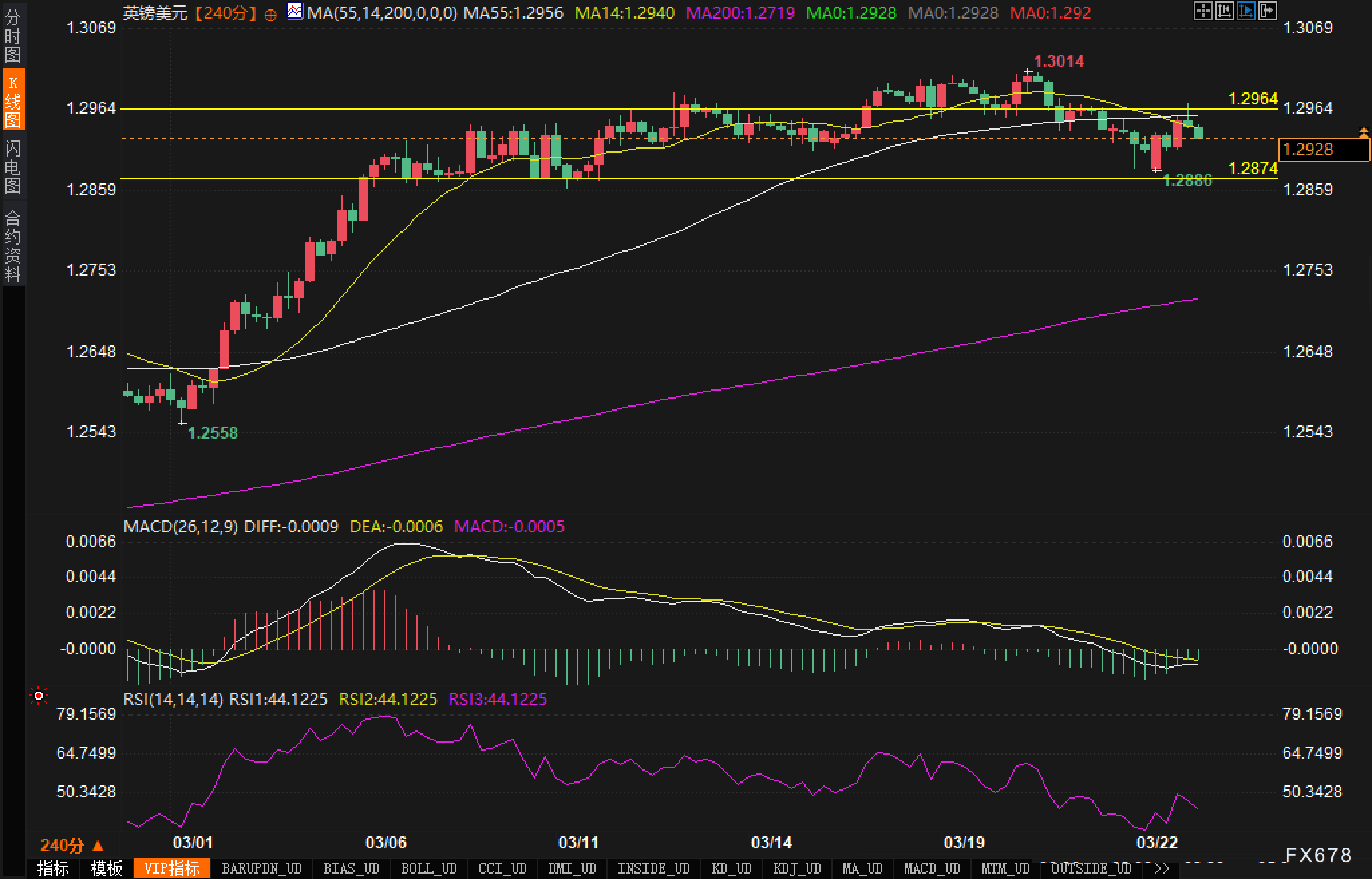 从240分钟图分析,英镑/美元近期在1.2860至1.2964区间内震荡整理。在3月初的强劲上涨后,汇价一直在此区间内寻找方向。RSI指标目前位于44.12,处于中性区域,表明市场既不处于超买也不处于超卖状态。MACD指标显示动能有所减弱,但尚未形成明确的看跌信号。关键支撑位位于1.2874,若失守可能进一步下探至1.2800心理关口;而上方阻力位首先在1.2964,突破后目标看向3月高点1.3014。