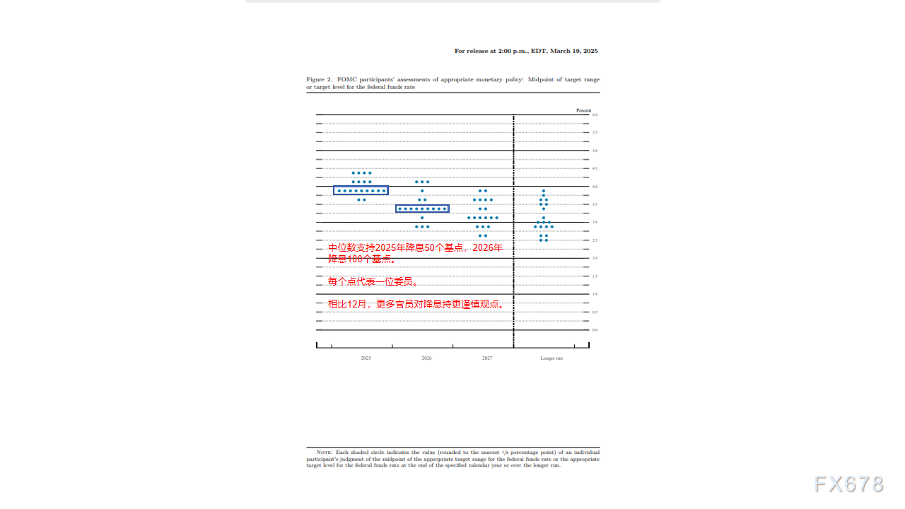 美联储点阵图显示,2025年预计将降息两次,去年12月预计为降息两次;长期联邦基金利率预期中值为3.0%,去年12月预期为3.0%。美联储将于4月1日开始放缓资产负债表缩减步伐。