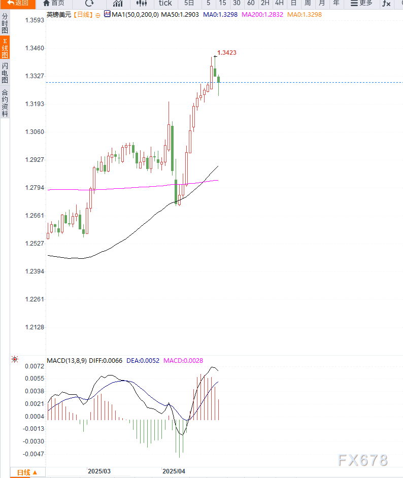 技术图形显示,若英镑未能守住1.3280附近支撑位,后续可能回测50日均线附近的1.3200。反之,若市场对英国央行维持利率稳定的预期回升,英镑有望再次挑战1.3424高点。
