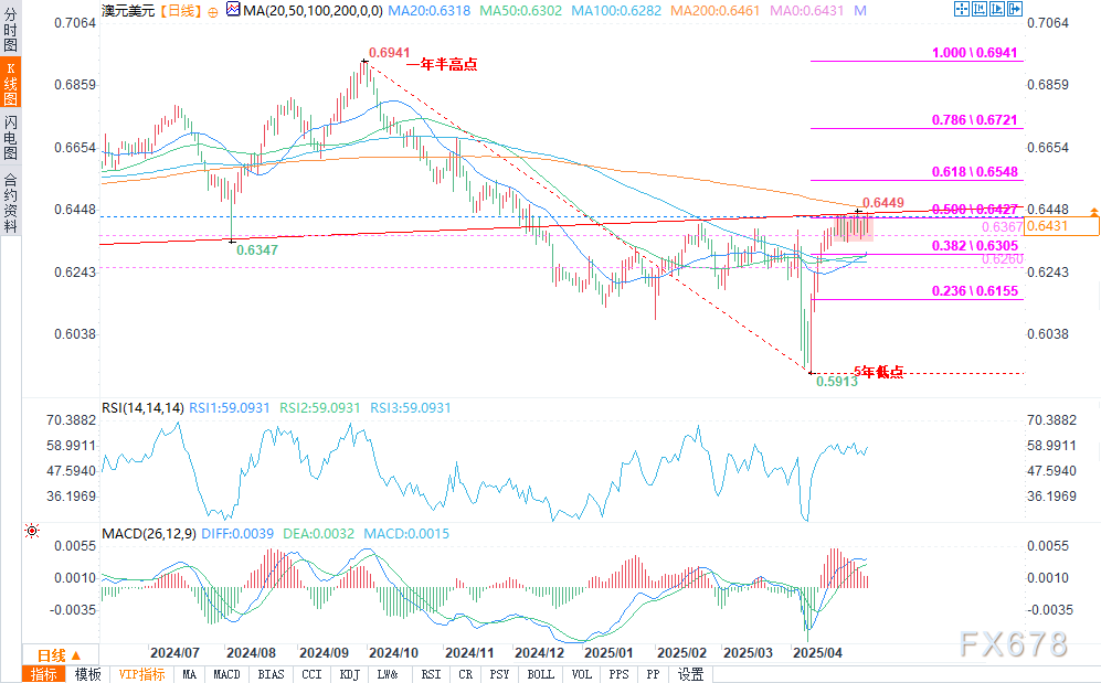 若能升破0.6457的200日简单移动平均线,初步可能会在0.6500这一心理关口与0.6548的61.8%斐波那契回撤位之间的某个位置遇阻停滞。若能决定性地突破后者,则可能引发显著的上涨动能,朝着0.6638的阻力位进发,甚至有可能进一步涨至0.6720的78.6%斐波那契回撤位。