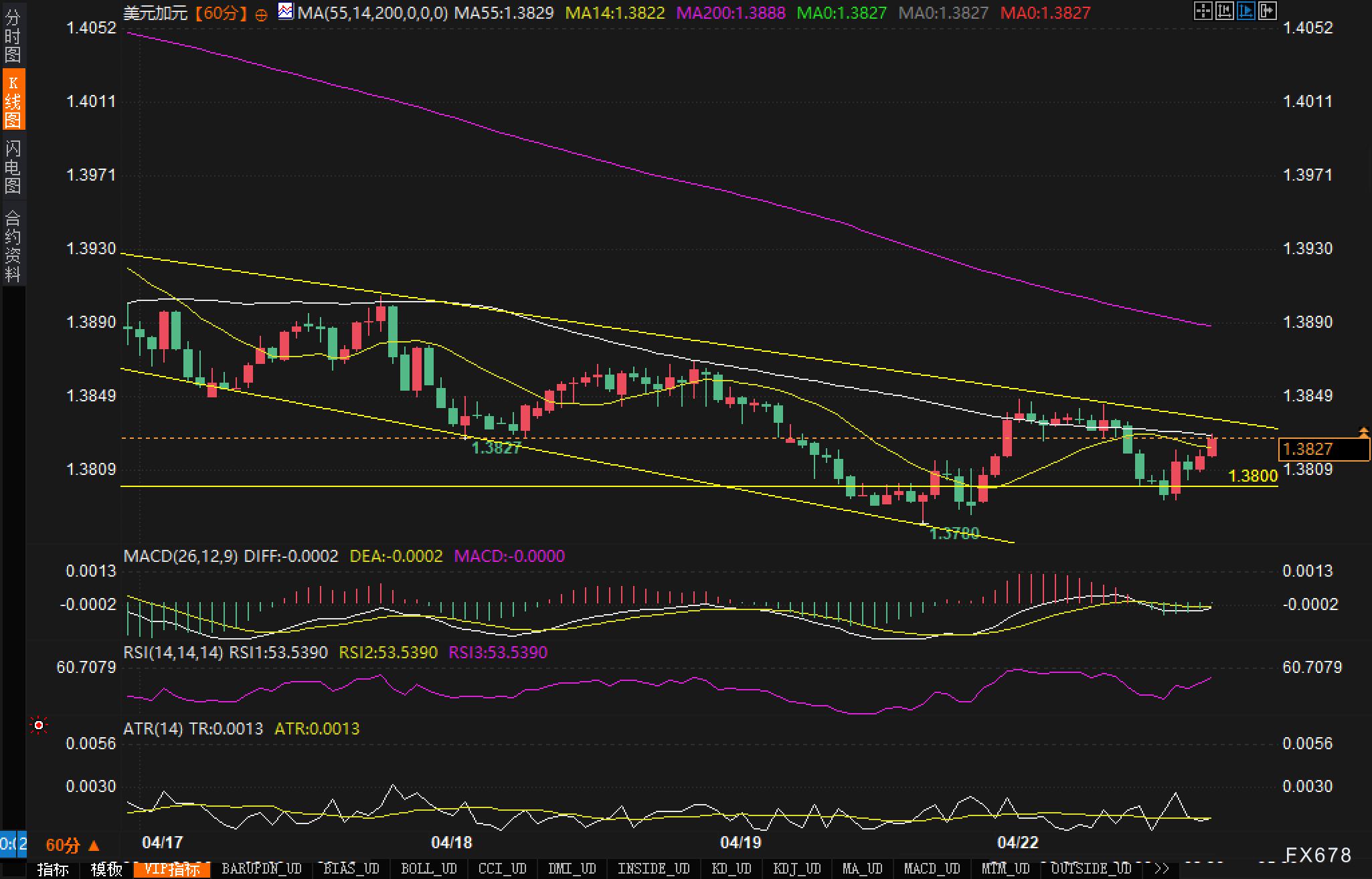 值得注意的是,小时图中汇价在1.3800一线附近受到下降通道下轨支撑,若短线再次跌破该支撑位,可能引发进一步的下行空间,但若反抽至通道上轨上方,则可能触发一定程度的技术性反弹。