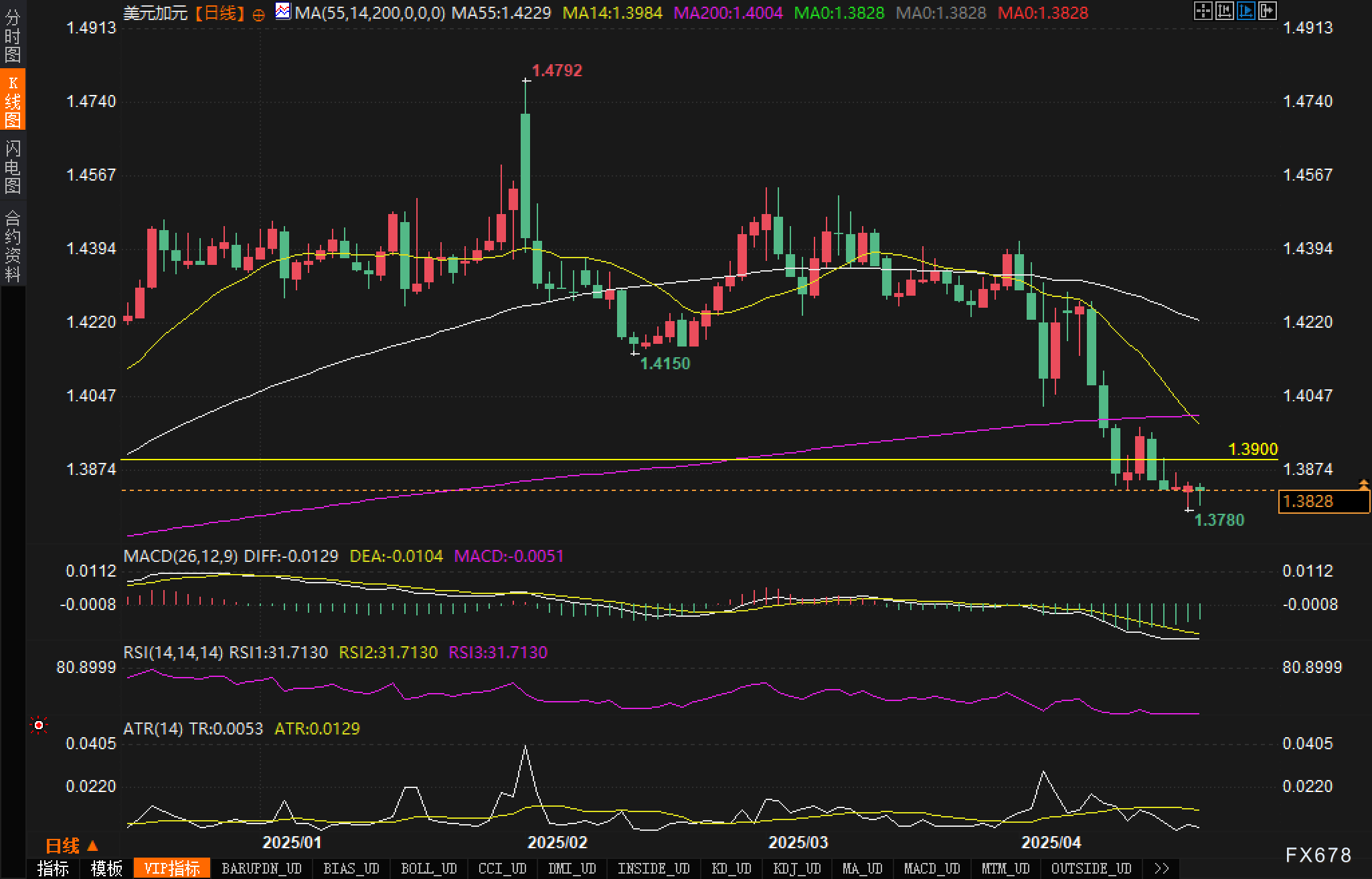 从日线图来看,美元兑加元近期自1.4792高位展开的下降趋势相当明显,且已经跌破了1.3900这一前期关键支撑位。目前汇价在1.3800区域附近徘徊,技术上呈现持续走弱特征。MACD指标依旧在零轴下方运行,柱状图为负,强化了空头氛围。而RSI则在31.71一线,已经逼近超卖区域,意味着短期若继续快速下挫,可能触发技术性反弹或超卖修正。值得关注的是,日线图上的平均真实波幅(ATR)较小时图更高,表明近期波动率在日线级别仍偏强,一旦多空力量出现新的分化,或将带来较大幅度的波动。